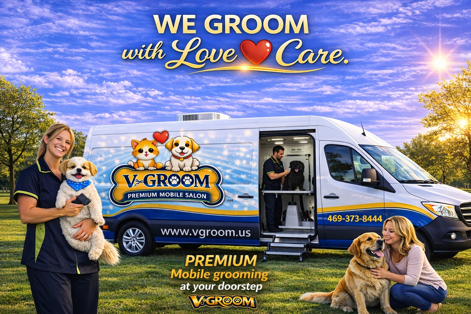 At V-GROOM, we bring a luxury grooming experience directly to your home, providing professional, stress-free care for your beloved pets. Our fully equipped mobile grooming vans create a safe, private, and cage-free environment where your pet receives one-on-one attention.